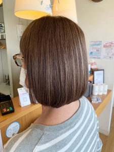 ハイライトを重ねていれて徐々に明るくしながら根元のカラーも明るくしていき、伸びてきた根本の白髪がぼけて目立たなくするようにしていきました!